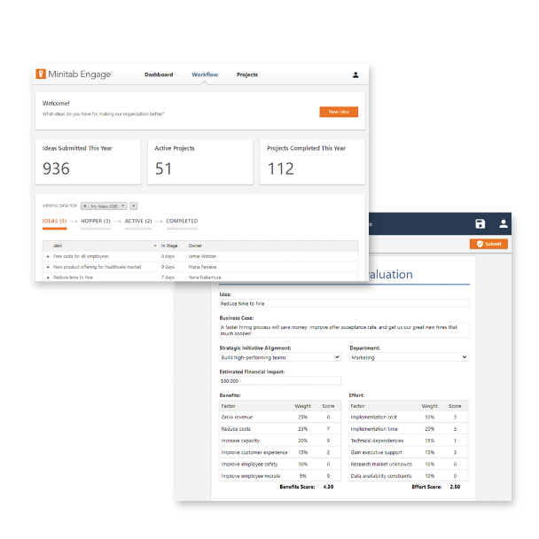 激励团队通过在从想法产生到执行的过程中,使用 Minitab Engage 来启动、跟踪、管理和共享创新和改进计划,