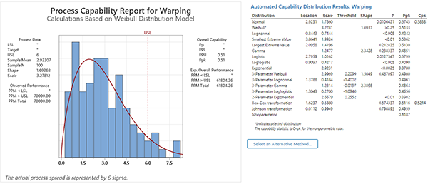 自动化功能确定正态分布的适当性,并自动提供替代分布拟合或变换。