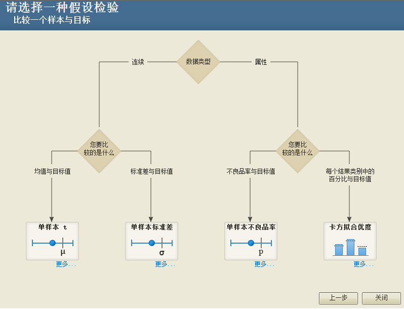 交互式决策树通过提出一系列需要您回答的问题(例如,您正在处理的数据类型、您分析的目标)引导您使用正确的统计工具。