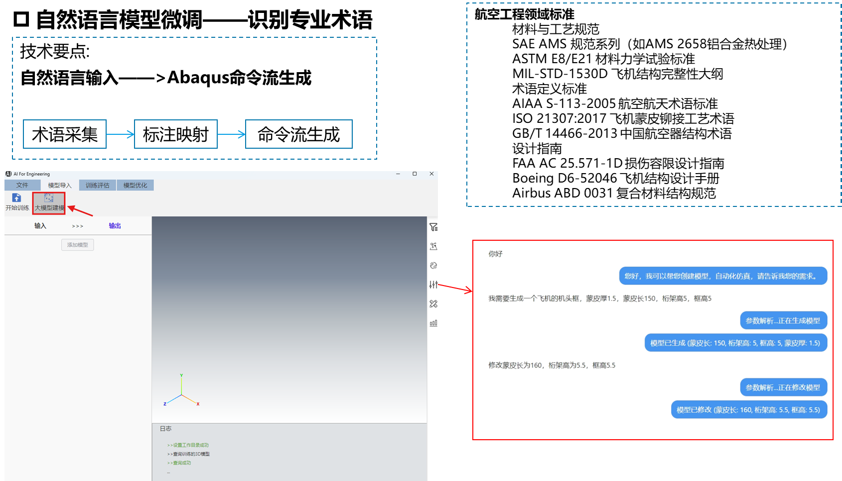 - 引入人工辅助标注与语言训练,并通过CAE/CAD功能接口实现对话式调用,形成可被自动调度与优化的私域模型应用,最终由AI模型验证与设计确认。